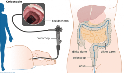 Een colonoscopie heet ook wel een coloscopie. Het is een onderzoek waarbij we de binnenkant (het slijmvlies) van de dikke darm bekijken. We gebruiken voor dit onderzoek een endoscoop. Een endoscoop is een flexibele, bestuurbare slang met een ingebouwde videocamera. We schuiven de endoscoop via uw anus in de dikke darm.