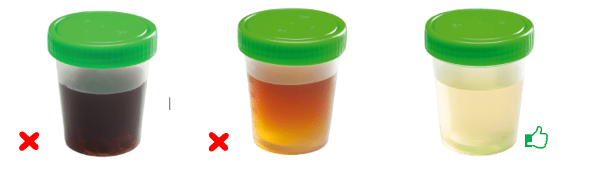 Hieronder ziet u hoe helder de ontlasting moet zijn. Vergelijk uw ontlasting met het laatste plaatje. Is uw ontlasting nog niet zoals het laatste plaatje? Drink dan nog extra heldere dranken tot uw ontlasting wel zo geel en helder is.