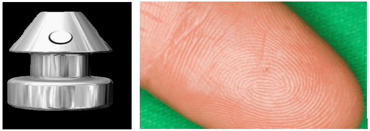 Behandelen we u met iStents? Dan brengen we tijdens een operatie 2 heel kleine implantaten (iStents) in uw oog. De iStents zijn buisjes van titanium, die maar 0,3 mm groot zijn. Op de foto linksboven ziet u hoe een iStent eruit ziet. De foto rechtsboven laat zien hoe klein deze implantaatjes eigenlijk zijn. Hieronder ziet u waar de iStents komen in het oog. In werkelijkheid zijn ze veel kleiner dan op deze afbeelding: u kunt ze niet zien.